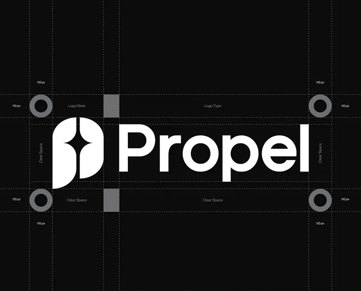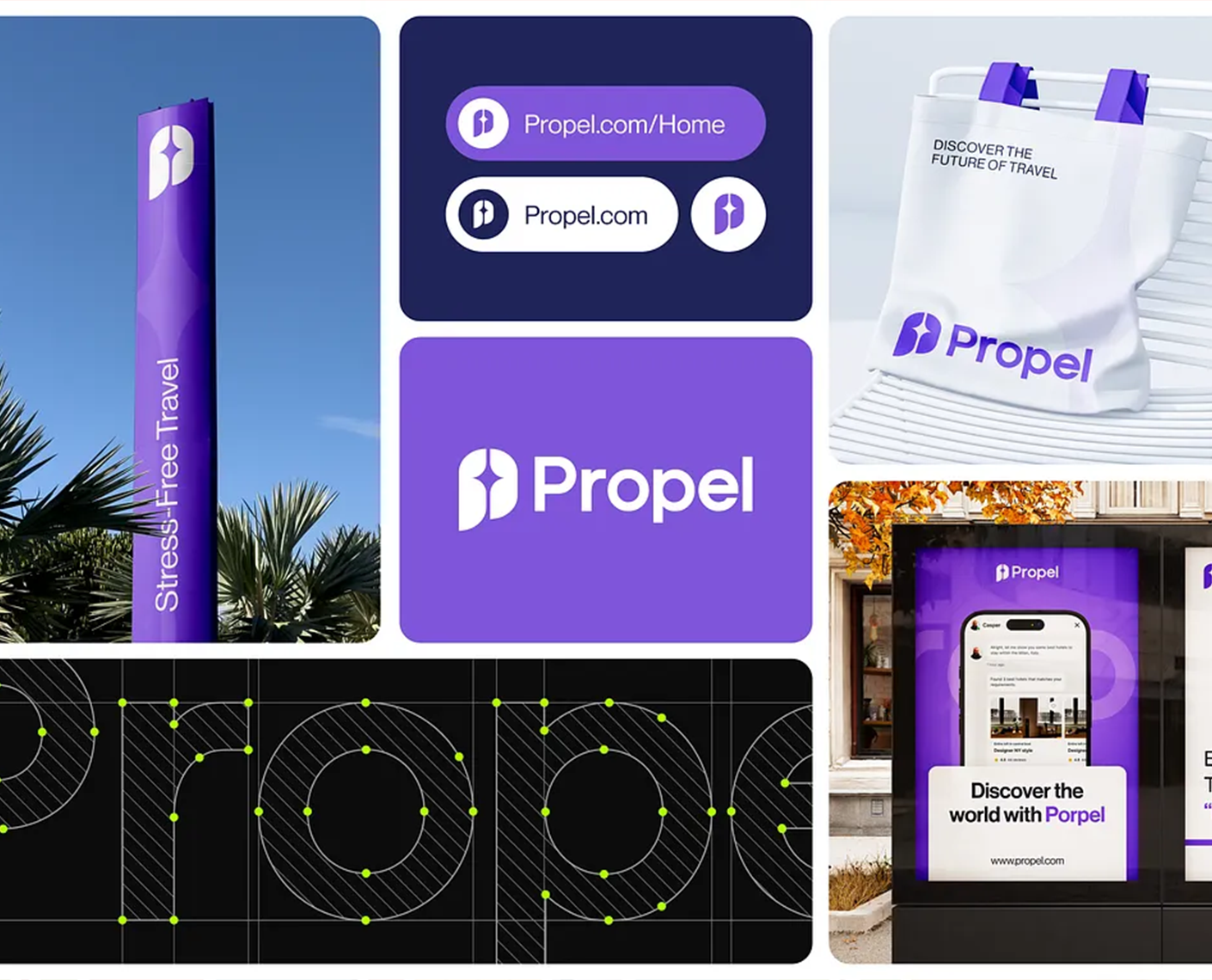 The primary challenge was to differentiate Propel in a crowded travel tech market dominated by established players like TripAdvisor and Expedia. The client wanted a brand that felt innovative and approachable, avoiding clichés like globes or airplanes, while emphasizing AI's role in making travel "propelled" forward—hence the name. Objectives included: developing a scalable logo that works in small formats (e.g., app icons) and large ones (e.g., billboards); creating a visual language with purple tones to evoke trust, creativity, and energy; ensuring the design supports multilingual interfaces for global users; and integrating practical elements like clear space guidelines for consistent application. Budget constraints meant prioritizing versatile assets that could be easily adapted by the client's in-house team post-delivery.